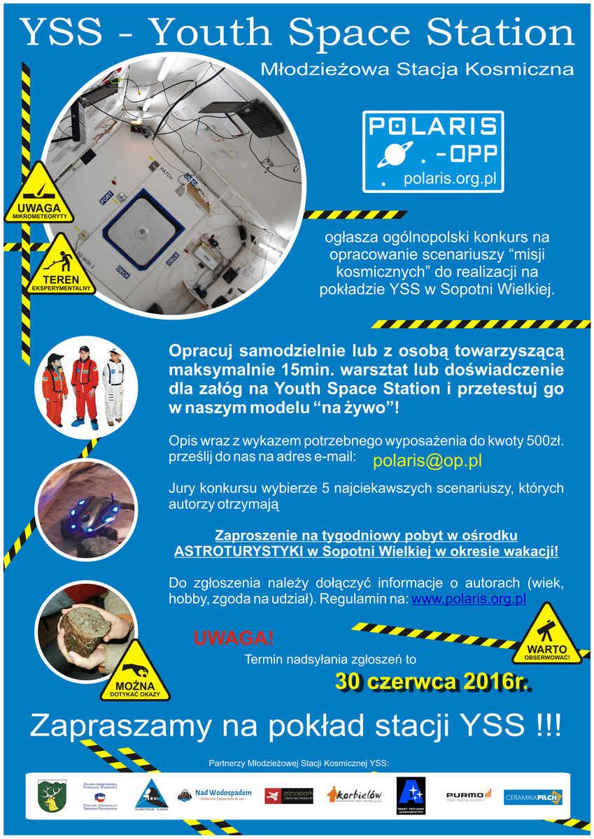 Stowarzyszenie Polaris organizuje nietypową akcję popularyzatorską z zakresu astronautyki i nauk pokrewnych dotyczącą opracowania autorskich scenariuszy symulacji misji kosmicznych na pokładzie jedynej w Polsce Młodzieżowej Stacji Kosmicznej YSS. Model wnętrza obchodzić będzie 10 lat od powstania pomysłu i nawiązania współpracy z amerykańską agencją NASA. Z tej okazji organizatorzy zapraszają wszystkich pasjonatów astronautyki, astronomii, elektroniki, botaniki, fizyki czy innych dziedzin pokrewnych do ogólnopolskiego konkursu, w którym można wygrać pięć dwuosobowych zaproszeń na tygodniowy pobyt w ośrodku Astroturystyki w Sopotni Wielkiej wraz z zajęciami na pokładzie Youth Space Station. Koncepcje przebiegu misji należy opracować zgodnie z informacją przedstawioną na plakacie oraz w Regulaminie konkursu.