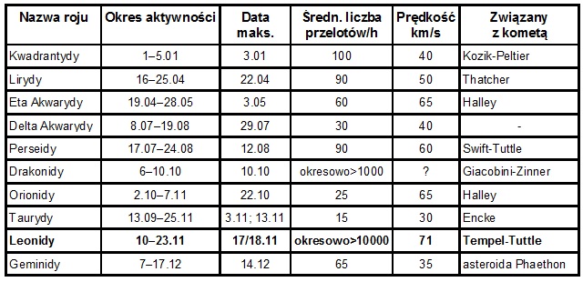W tabelce podano główne roje meteorów obserwowane w Polsce: