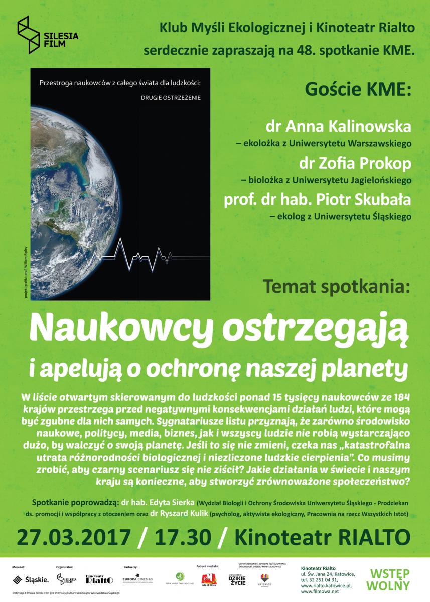 We wtorek 27 marca 2018 roku o godz. 17.30 w Kinoteatrze Rialto w Katowicach rozpocznie się LXVIII spotkanie Klubu Myśli Ekologicznej, którego organizatorami są prof. dr hab. Piotr Skubała z Wydziału Biologii i Ochrony Środowiska Uniwersytetu Śląskiego oraz dr Ryszard Kulik z Pracowni na rzecz Wszystkich Istot.