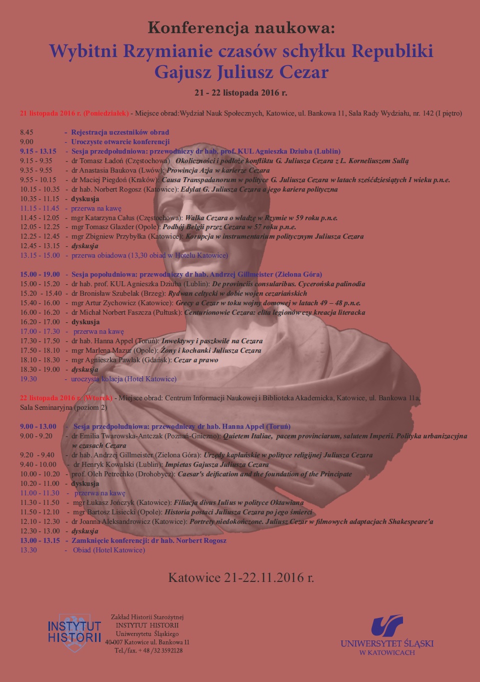 Pierwszy dzień obrad rozpocznie się o godz. 9.00 w sali Rady Wydziału Nauk Społecznych (Katowice, ul. Bankowa 11), natomiast drugi – także o godz. 9.00 w Centrum Informacji Naukowej i Bibliotece Akademickiej (Katowice, ul. Bankowa 11a). Podczas konferencji omówione zostaną m.in.: okoliczności konfliktu Gajusza Juliusza Cezara z Lucjuszem Korneliuszem Sullą, walka o władzę w Rzymie czy kwestie polityki urbanizacyjnej w I w. p.n.e.