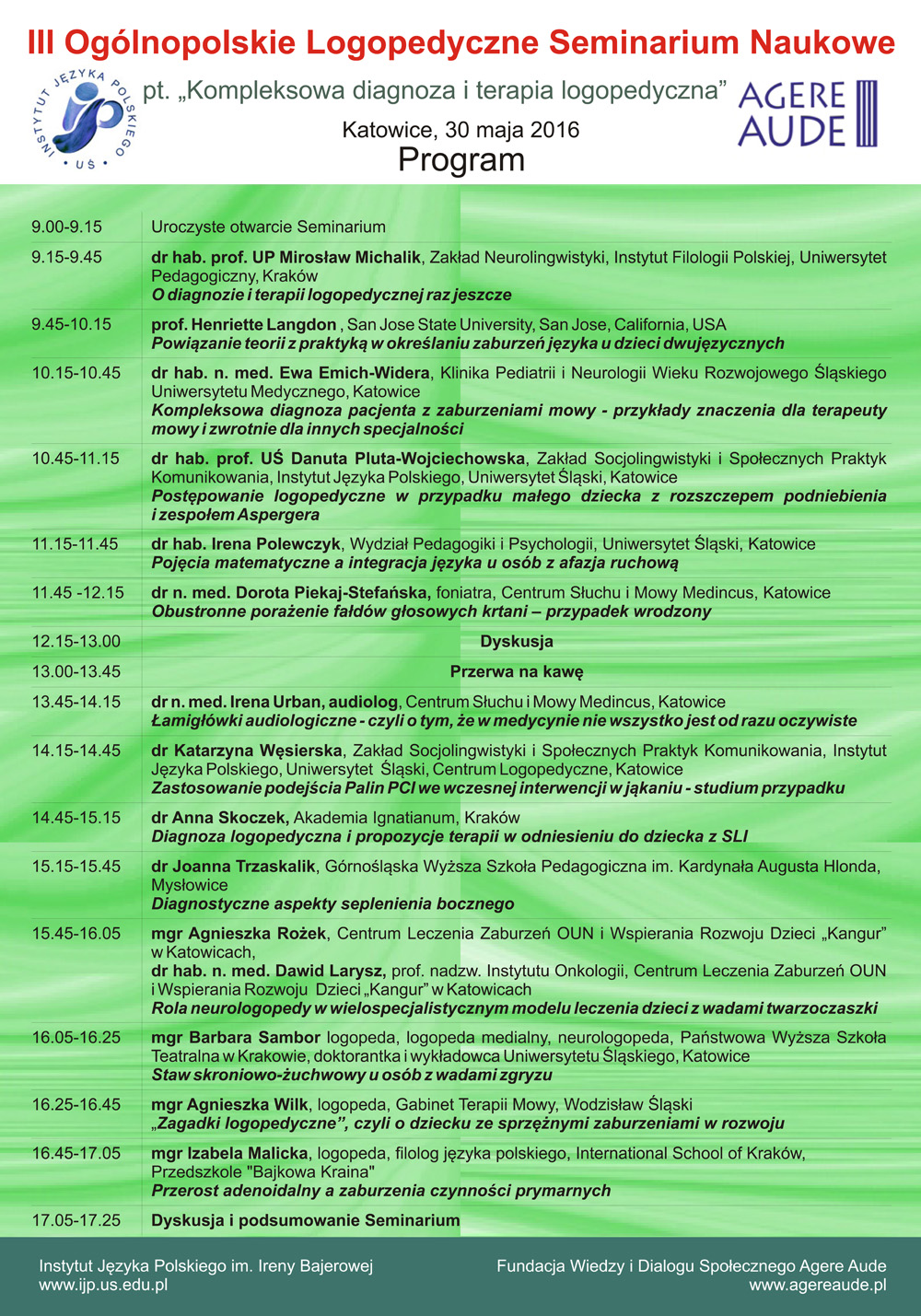 Jest to kolejny projekt realizowany w ramach działań promujących śląską logopedię. Seminarium poświęcone będzie problematyce kompleksowej diagnozy i terapii logopedycznej. Do wygłoszenia wykładów zaproszeni zostali eksperci z różnych dyscyplin: logopedzi, lekarze, pedagodzy. Spotkanie będzie również okazją do naukowej dyskusji, w której wezmą udział zaproszeni wykładowcy, w tym młodzi naukowcy.