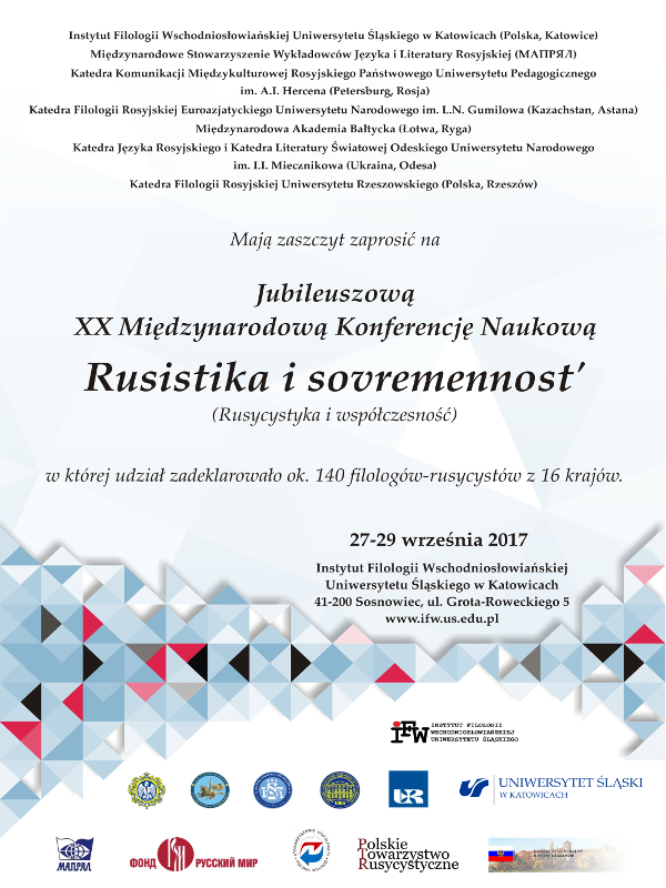 XX jubileuszowe spotkanie rusycystów z Europy i Azji po raz pierwszy odbędzie się w murach Uniwersytetu Śląskiego. Językiem roboczym konferencji będzie język rosyjski. Współorganizatorami wydarzenia są: Rosyjski Państwowy Uniwersytet Pedagogiczny w Sankt Petersburgu, Odeski Uniwersytet Narodowy, Bałtycka Akademia Międzynarodowa w Rydze, Euroazjatycki Uniwersytet Państwowy w Astanie oraz Uniwersytet Rzeszowski. Patronat nad tegoroczną edycją wydarzenia objęli Stowarzyszenie Współpracy Polska–Wschód, Polskie Towarzystwo Rusycystyczne oraz Konsul Generalny Federacji Rosyjskiej.