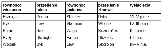 Ekliptyka – droga zaćmień – to koło wielkie na sferze niebieskiej zakreślane przez Słońce w ruchu rocznym, po prostu najstarszy kalendarz. I zawsze wzdłuż ekliptyki na niebie widzimy Księżyc i planety. Ten obszar w czasach starożytnych podzielono na 12 równych, części po 30 stopni każda, i nazwano znakami o nazwach pokrywających się z gwiazdozbiorami, na tle których się znajdowały. Równik niebieski (projekcja naszego ziemskiego równika) nachylony jest do płaszczyzny ekliptyki po katem 23°27', bo takie jest nachylenie osi ziemskiej. Jeden z punktów przecięcia równika niebieskiego z ekliptyką nazwano punktem Barana – bo był na tle gwiazdozbioru Barana, a drugi per analogiam punktem Wagi. W związku z tym, iż kiedy Słońce osiągało punkt Barana, pokrywało się to z nastaniem wiosny, przyjęto od tego momentu tak oznaczać początek kolejnej pory roku. Jako że Słońce jest wtedy również na równiku, czas jego przebywania nad horyzontem jest mniej więcej taki sam, jak czas przebywania pod horyzontem. Oznacza to, że dzień równy jest nocy i tak początek wiosny nazwano dniem równonocy wiosennej, w odróżnieniu od innego, jak się domyślamy, dnia równonocy jesiennej, kiedy to Słońce osiąga punkt Wagi. Dla pełnej jasności początek lata to punkt Raka (przesilenie letnie), a początek zimy punkt Koziorożca (przesilenie zimowe). Okazuje się jednak, że oś ziemska wykonuje ruch zwany precesją, podczas którego biegun świata zakreśla pewne koło w czasie ok. 25 700 lat – jest to tzw. rok platoński. Zauważył to już Hipparchos z Nikei (ok. 190–120 p.n.e.). Jest to skutkiem oddziaływania Księżyca i Słońca na niesferyczną Ziemię. Kiedy obserwacje astronomiczne były już prowadzone dość intensywnie punkt Barana był na tle gwiazdozbioru Barana, ale obecnie jest inaczej. Na przestrzeni dziejów punkty równonocy i przesileń znajdowały się na tle innych konstelacji, a wyglądało to tak: